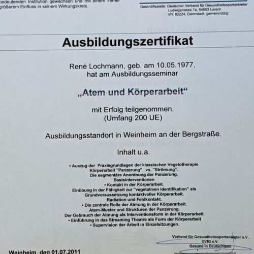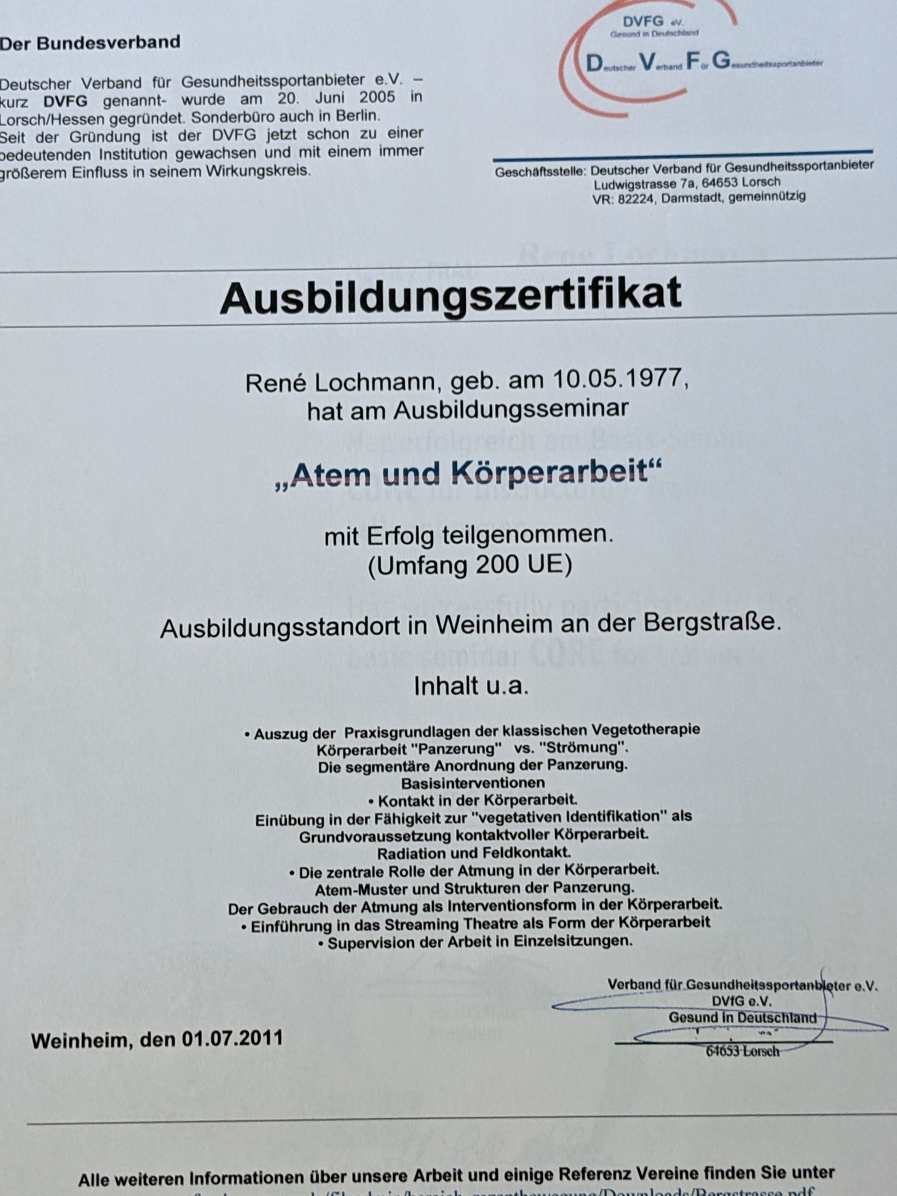 - Abschluss zum Körper-& Atemtherapeut DVFG e.V