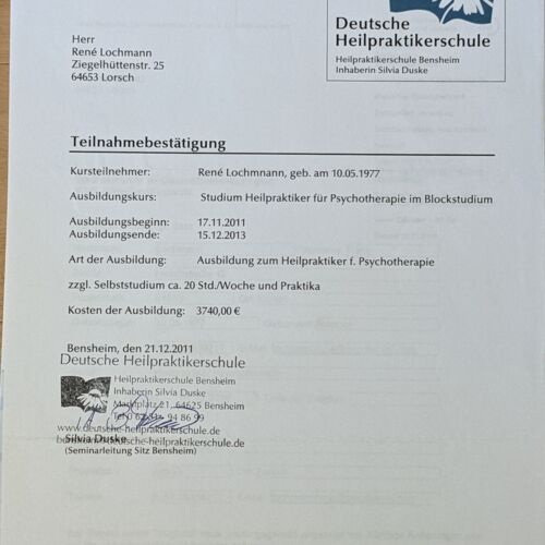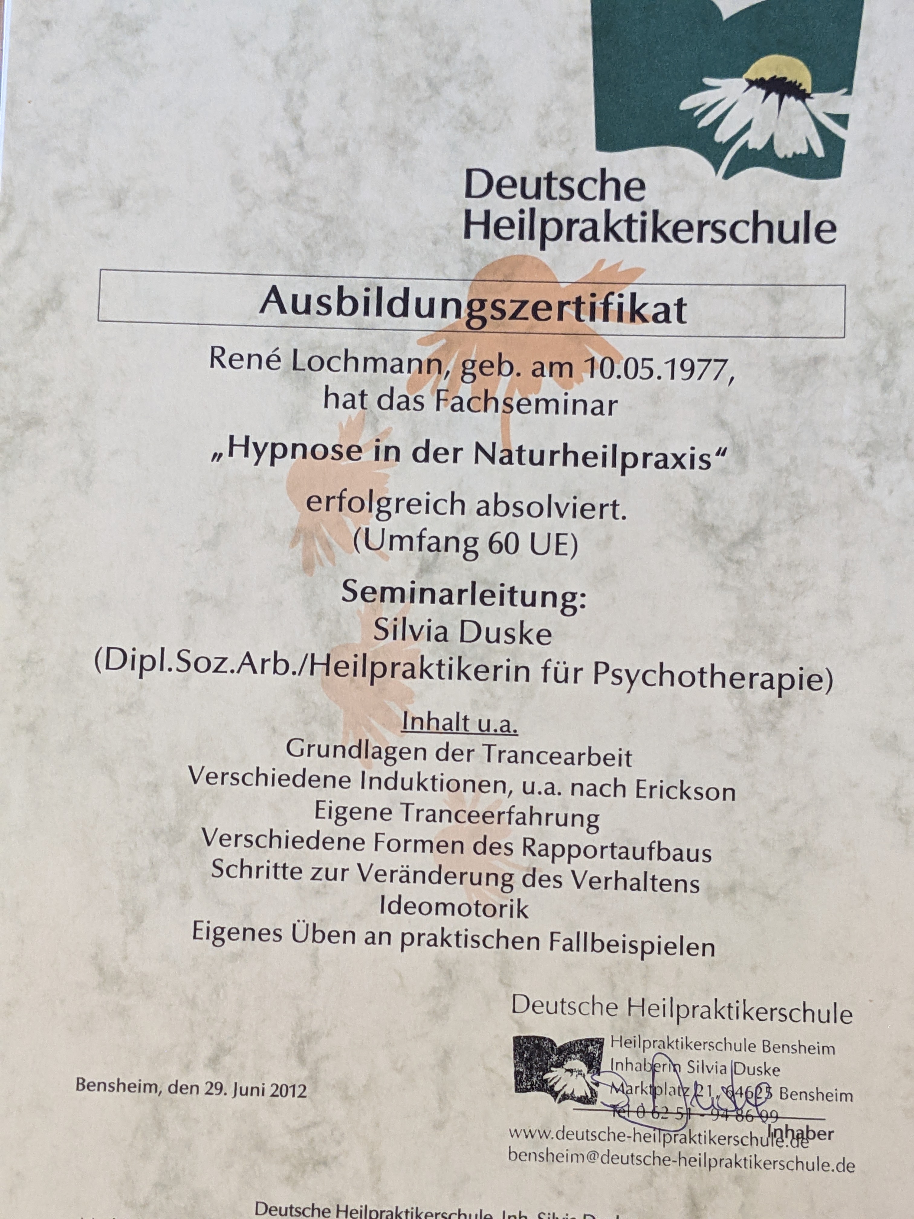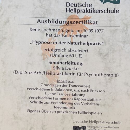 - Abschluss Hypnosetherapeut Deutsche Heilpraktiker- Schule Bensheim