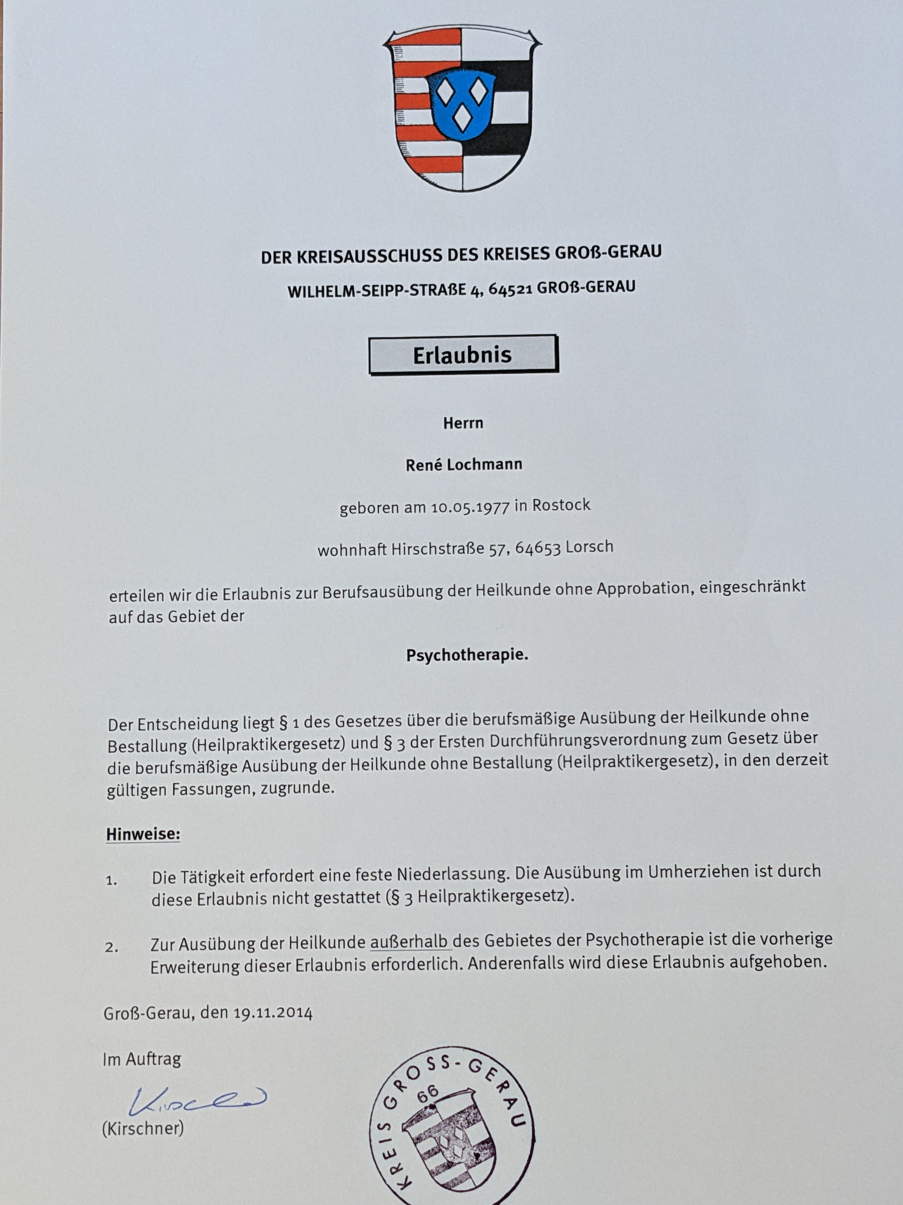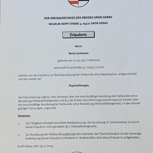 - Erteilung der Heilerlaubnis zur Psychotherapie lt. Heilpraktikergesetz über das Gesundheitsamt Groß- Gerau