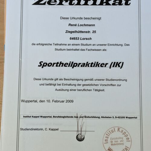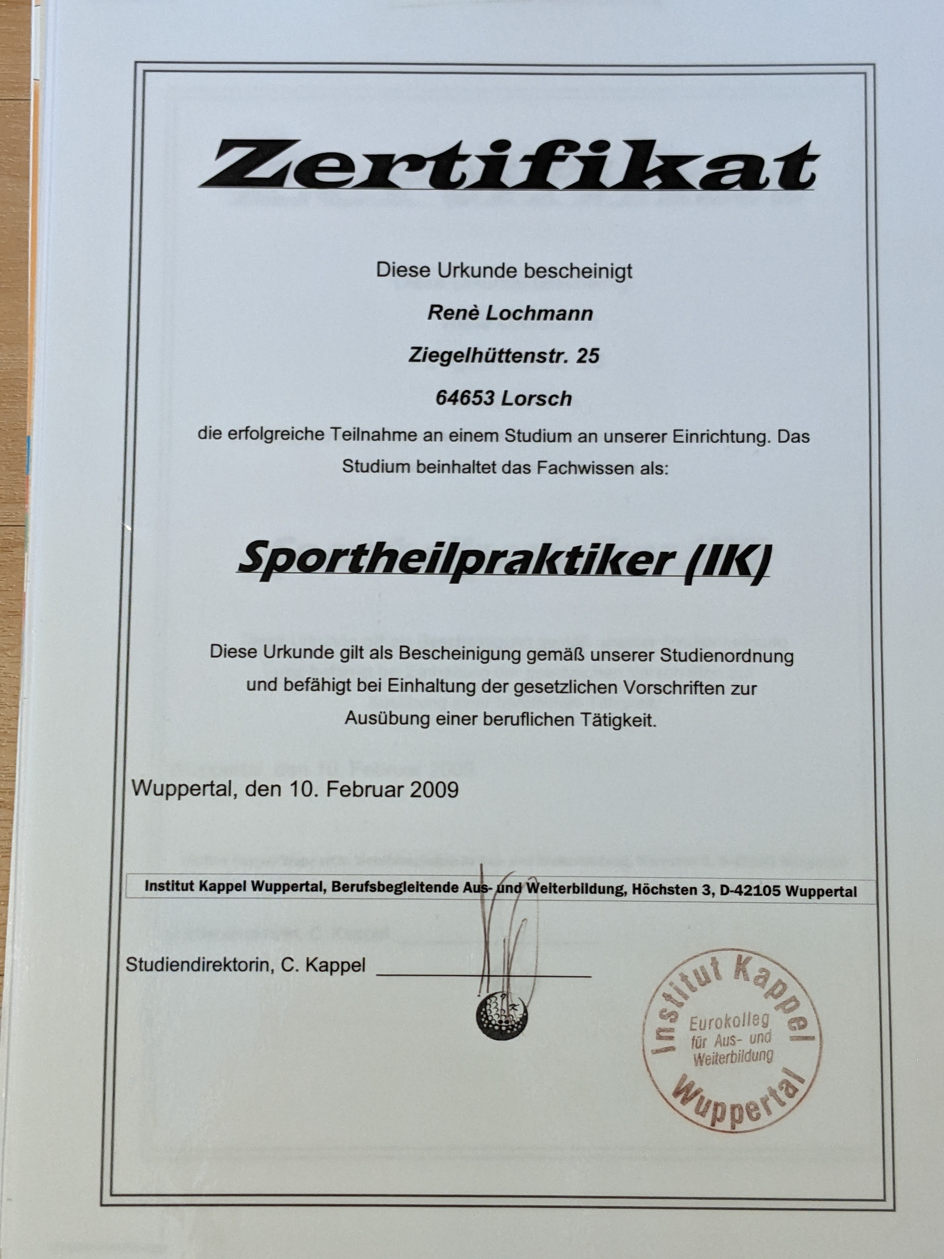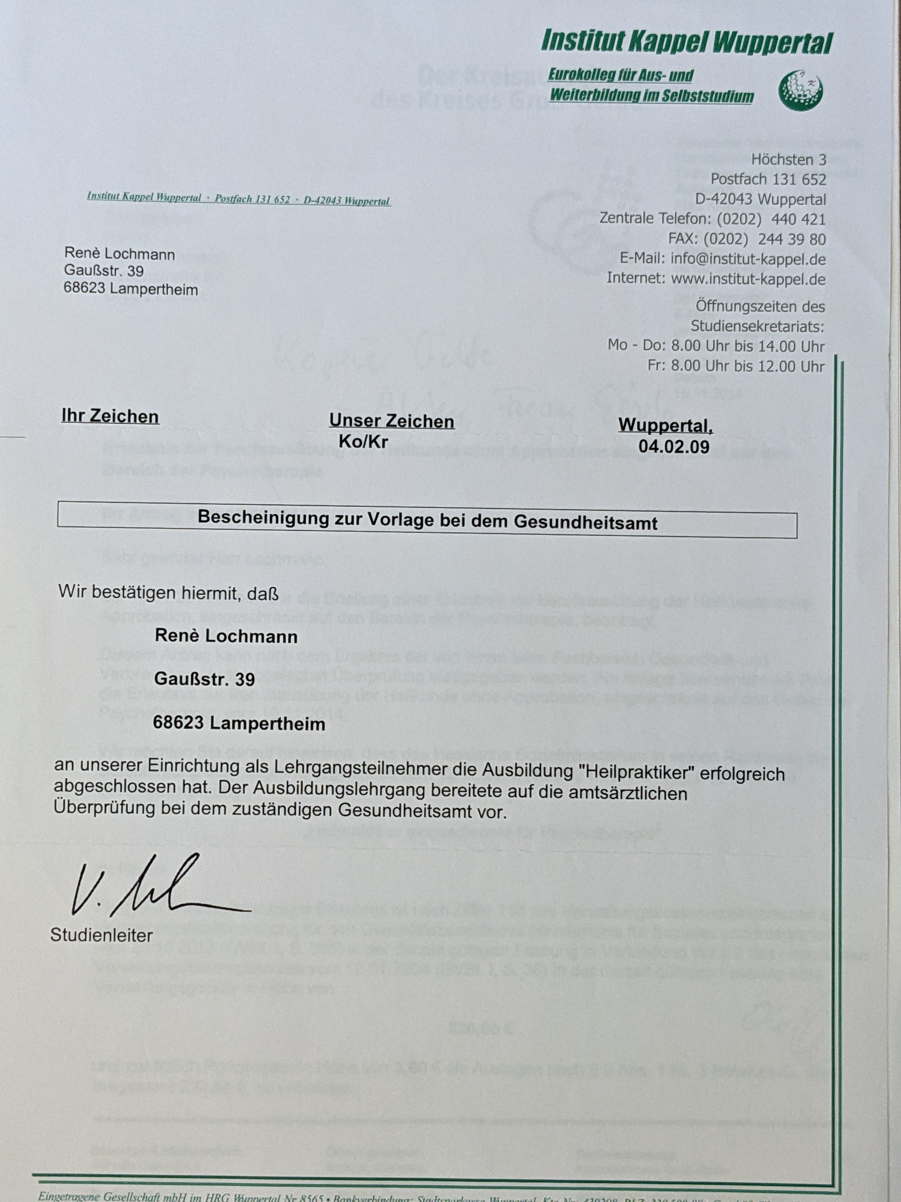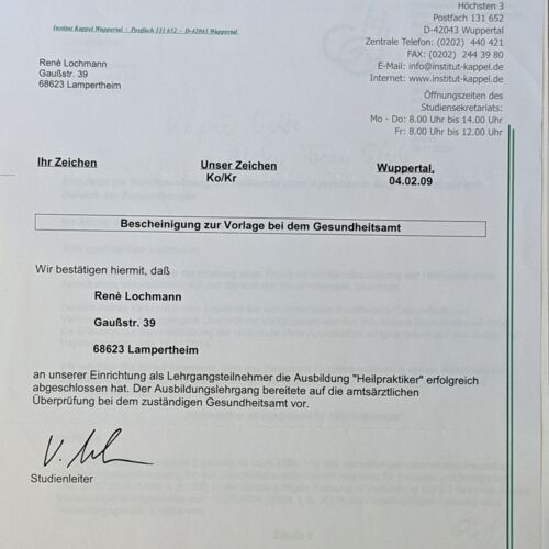 - Abschluss Studium Heilpraktiker, Institut Kappel, Wuppertal (Eurokolleg)