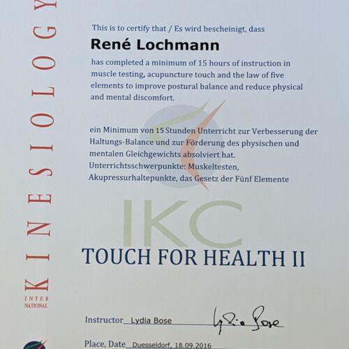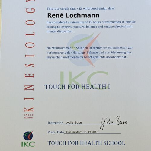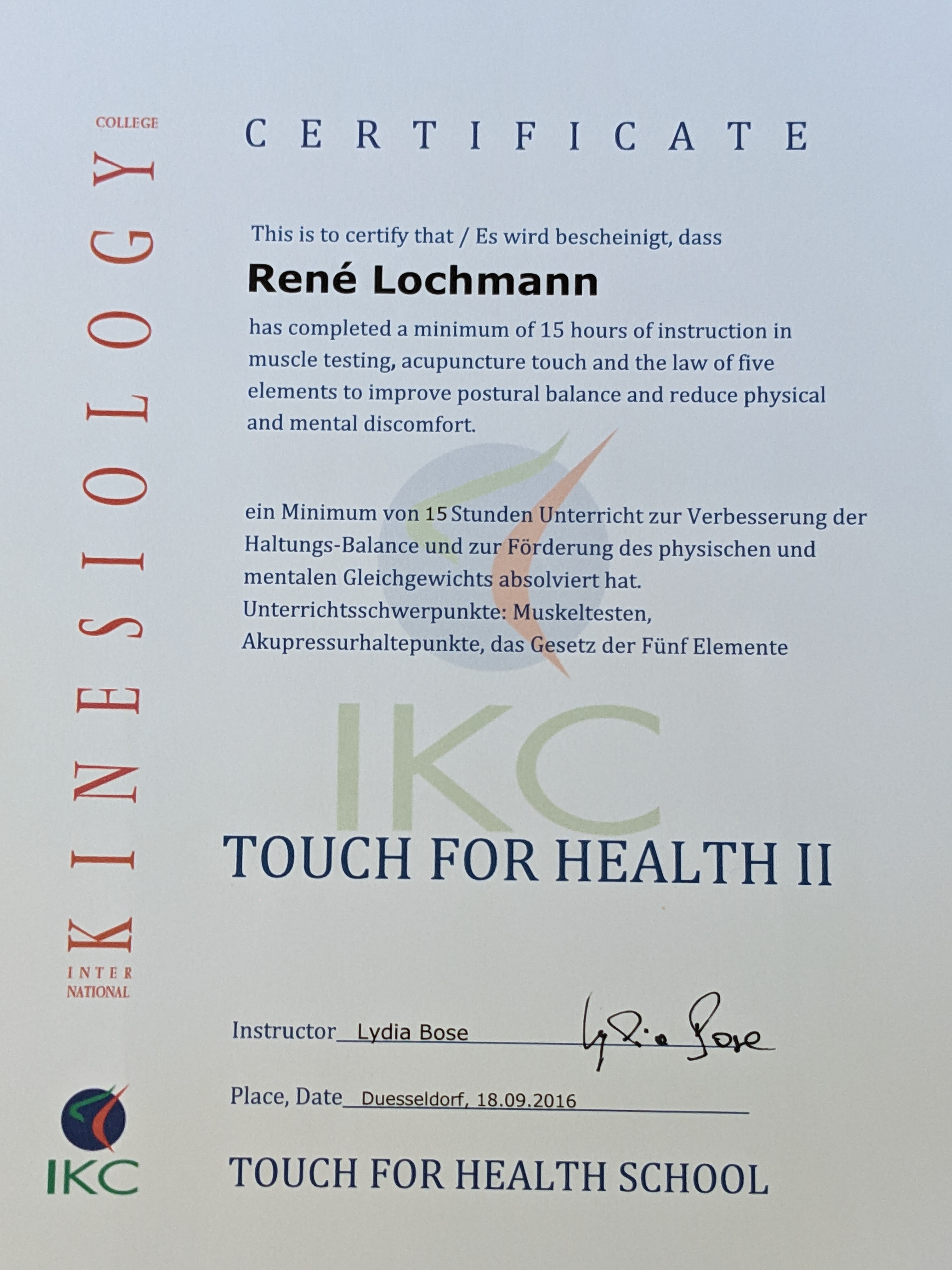 - Abschluss der Kinesiologie Stufe 1 und 2, Kinesiologie Verband Deutschland
