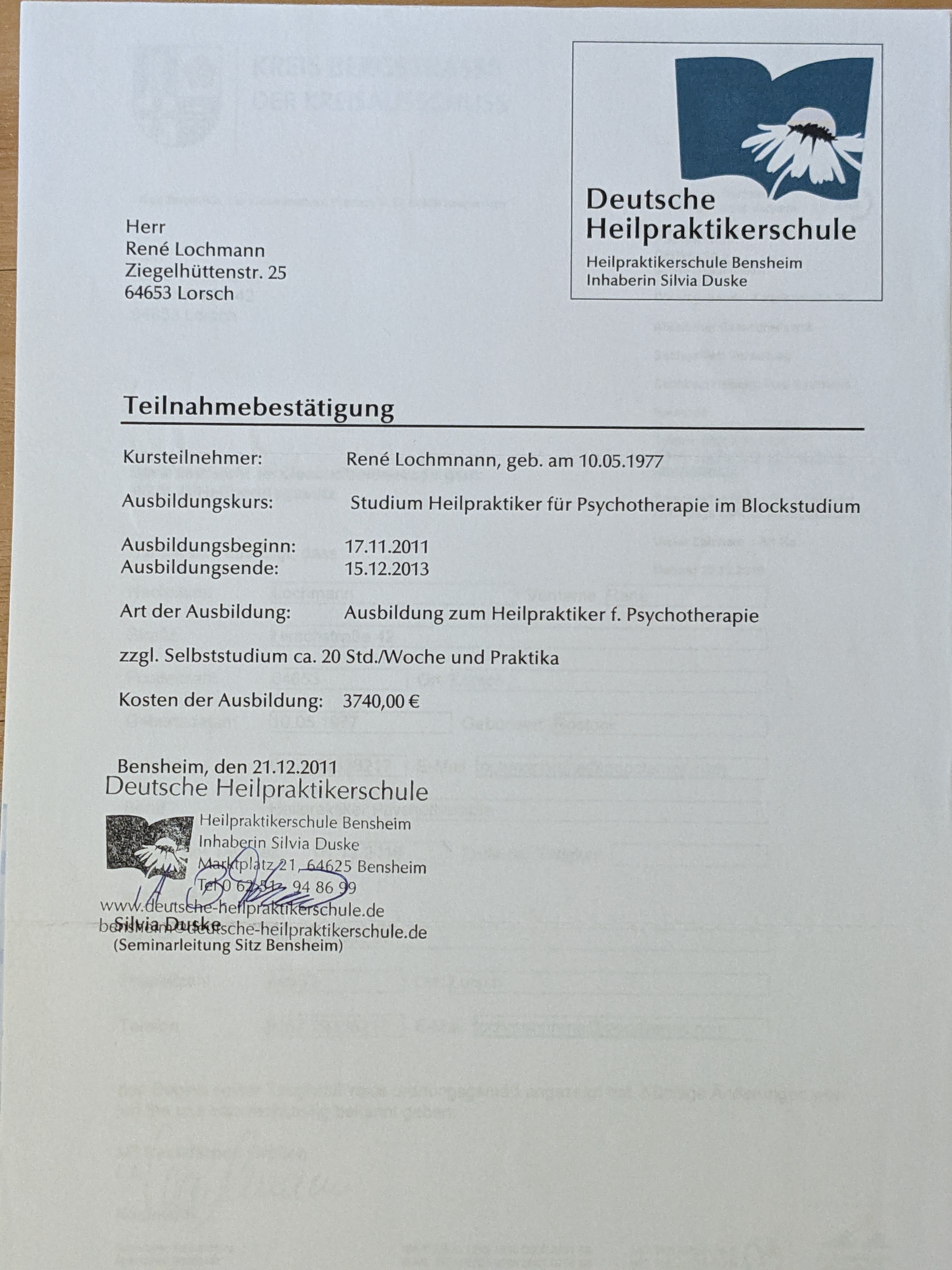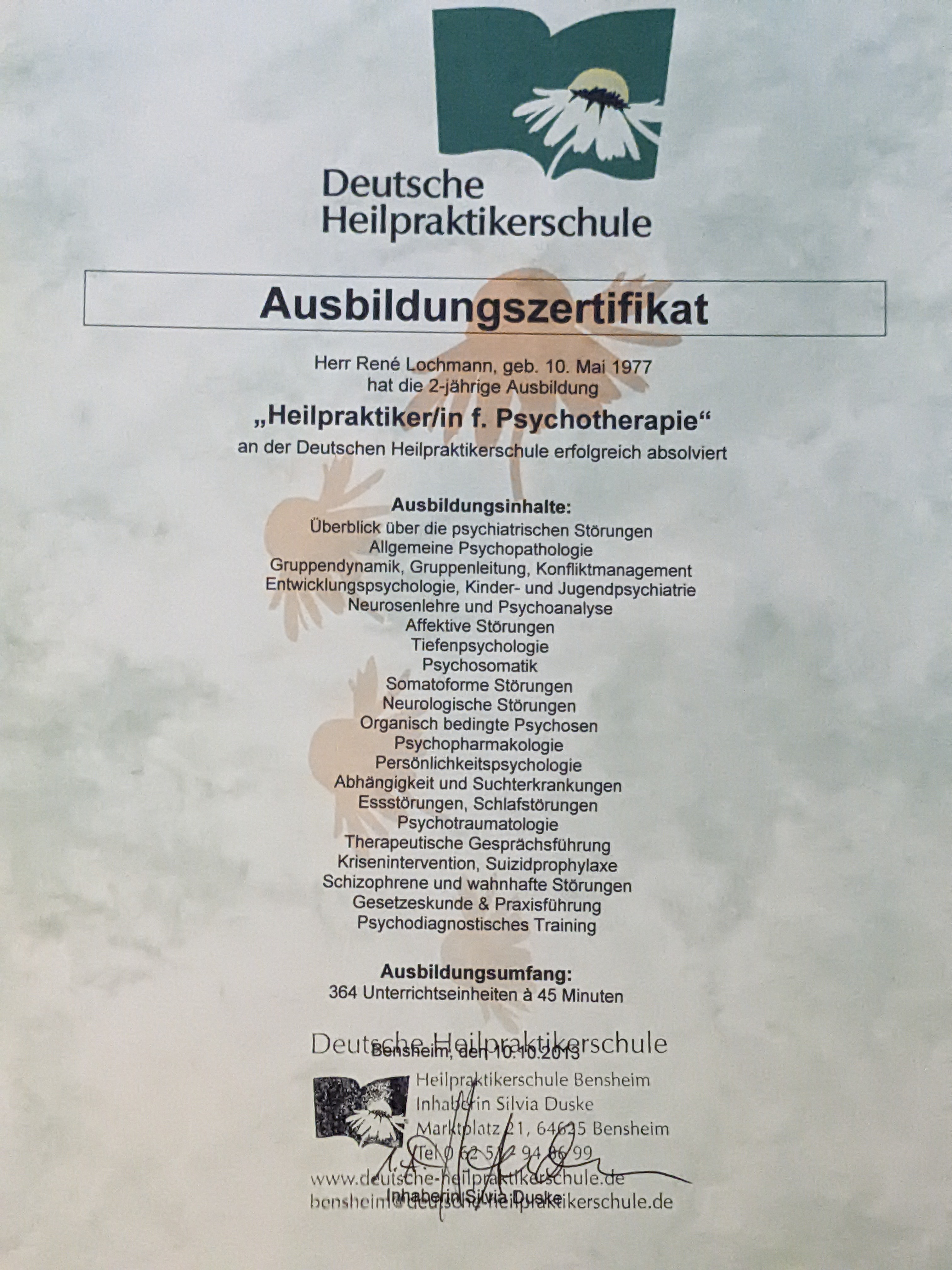 Abschluss des 2 Jährigen Vollzeitstudiums Psychotherapieverfahren der Deutschen Heilpraktiker Schule