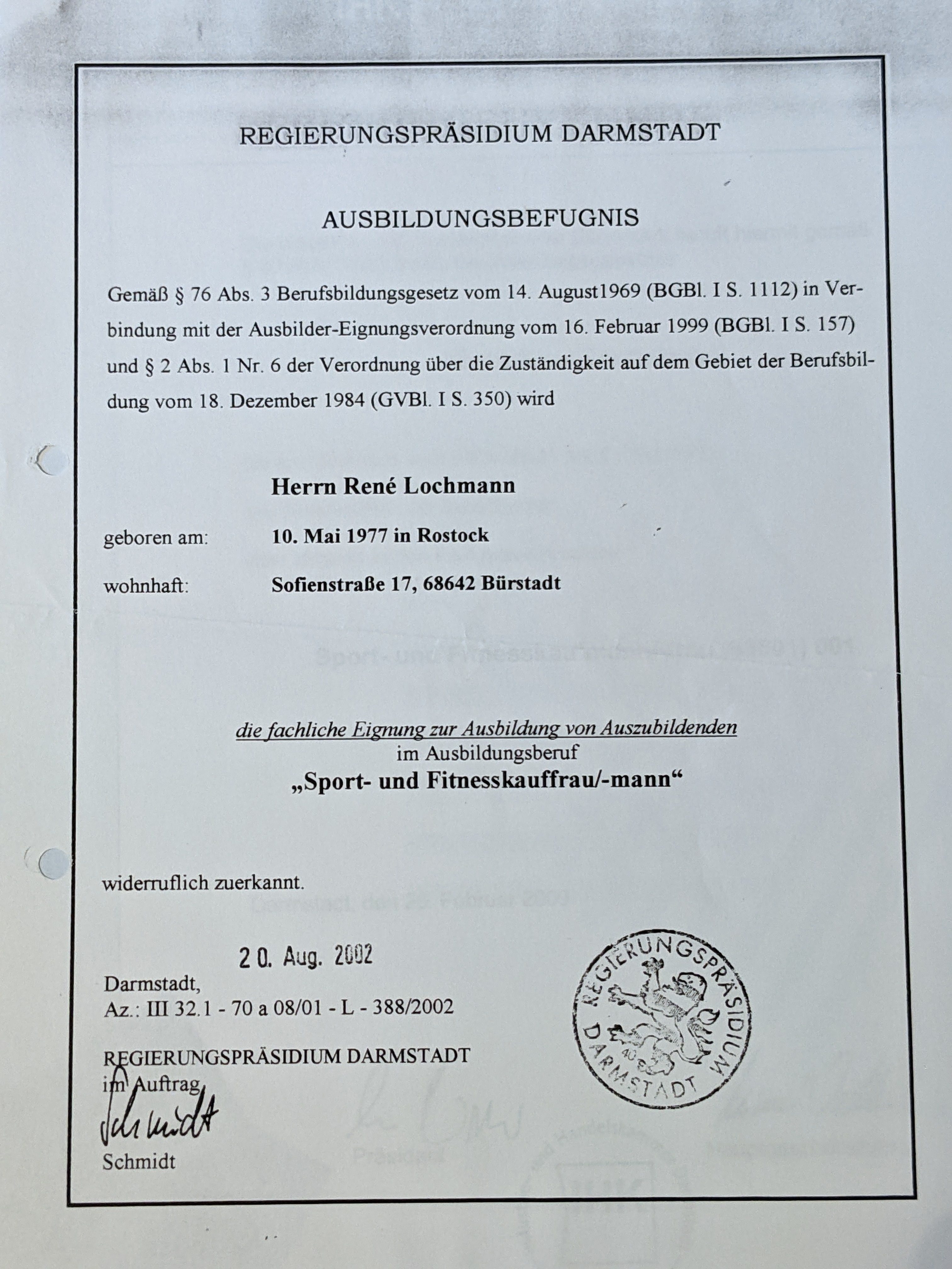- Übernahme des Fitness und Rehazentrum Lampertheim als Eigentümer und Inhaber